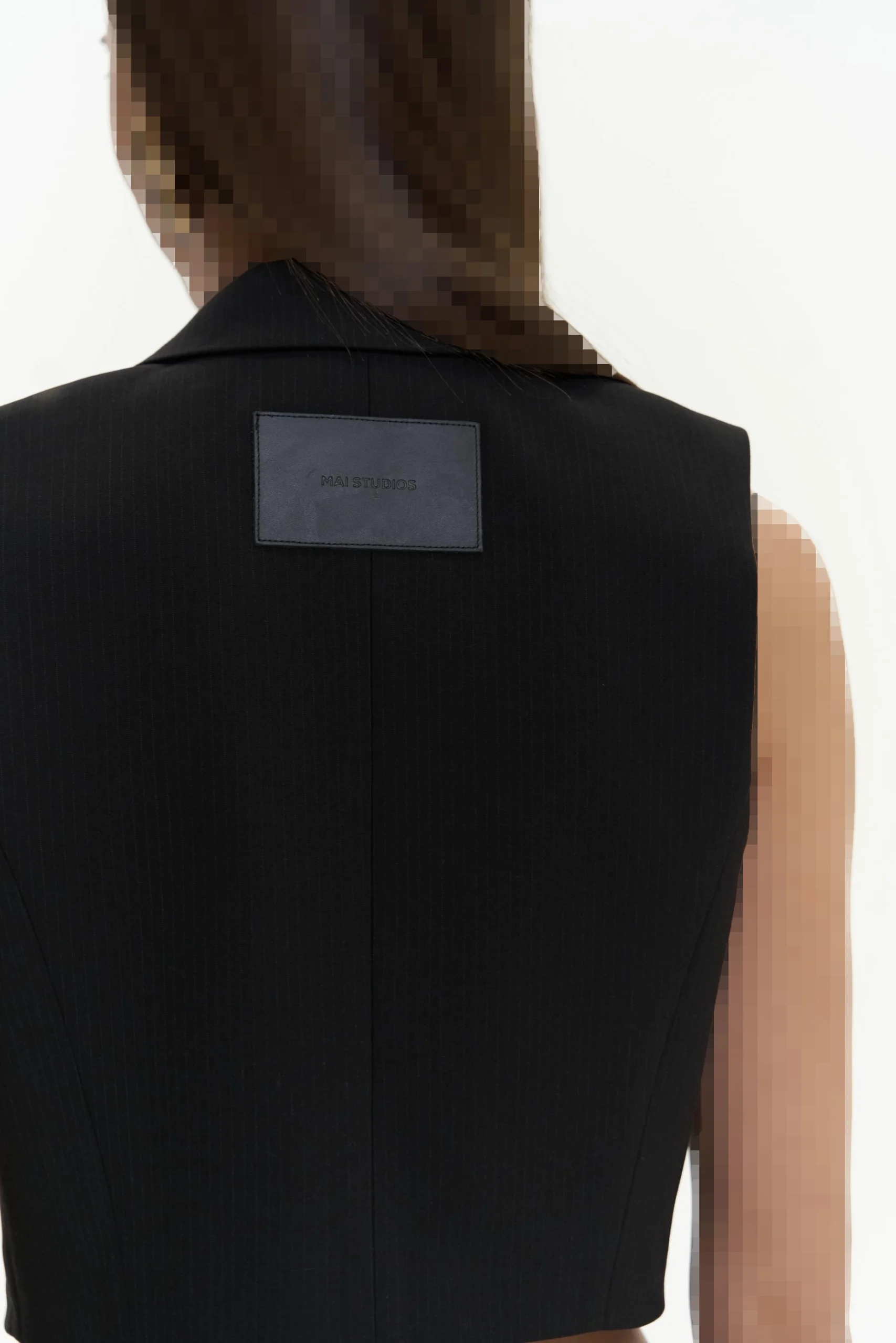 جلیقه راه راه بدون آستین، یقه هفت. جیب‌های قلاب‌دار با لبه‌های تاشو در جلو. پشت پارچه‌ای با رنگ متضاد، آستر داخلی. طرح لوگو چاپ شده روی چرم در پشت. بسته شدن با دکمه در جلو، جزئیات داخلی. شلوار کمر بلند با حلقه کمربند. دارای دو پلیسه، جیب‌های کناری و یک جیب پشت با دوخت مصنوعی. زیپ جلو و دکمه برای بسته شدن.