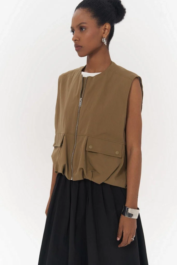 جلیقه بزرگ و یقه گرد. جیب گیره دار جلو و بسته شدن زیپ فلزی جلو.