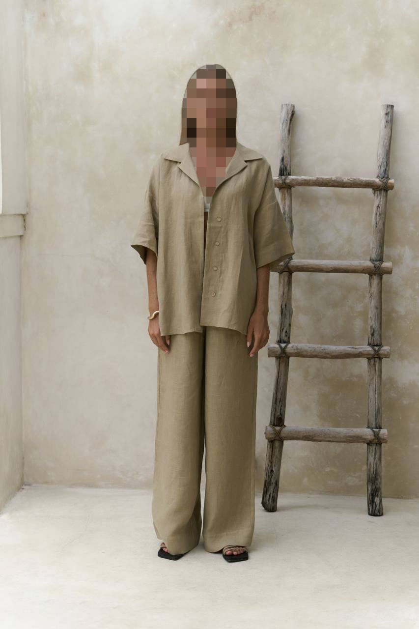 پیراهن 100% لینن یقه دار. نیم آستین، چاک در پهلو، بسته شدن دکمه در جلو. شلوار ترکیبی کتانی کمر بلند با کمربند الاستیک. جیب های کناری طراحی ساق پا پهن