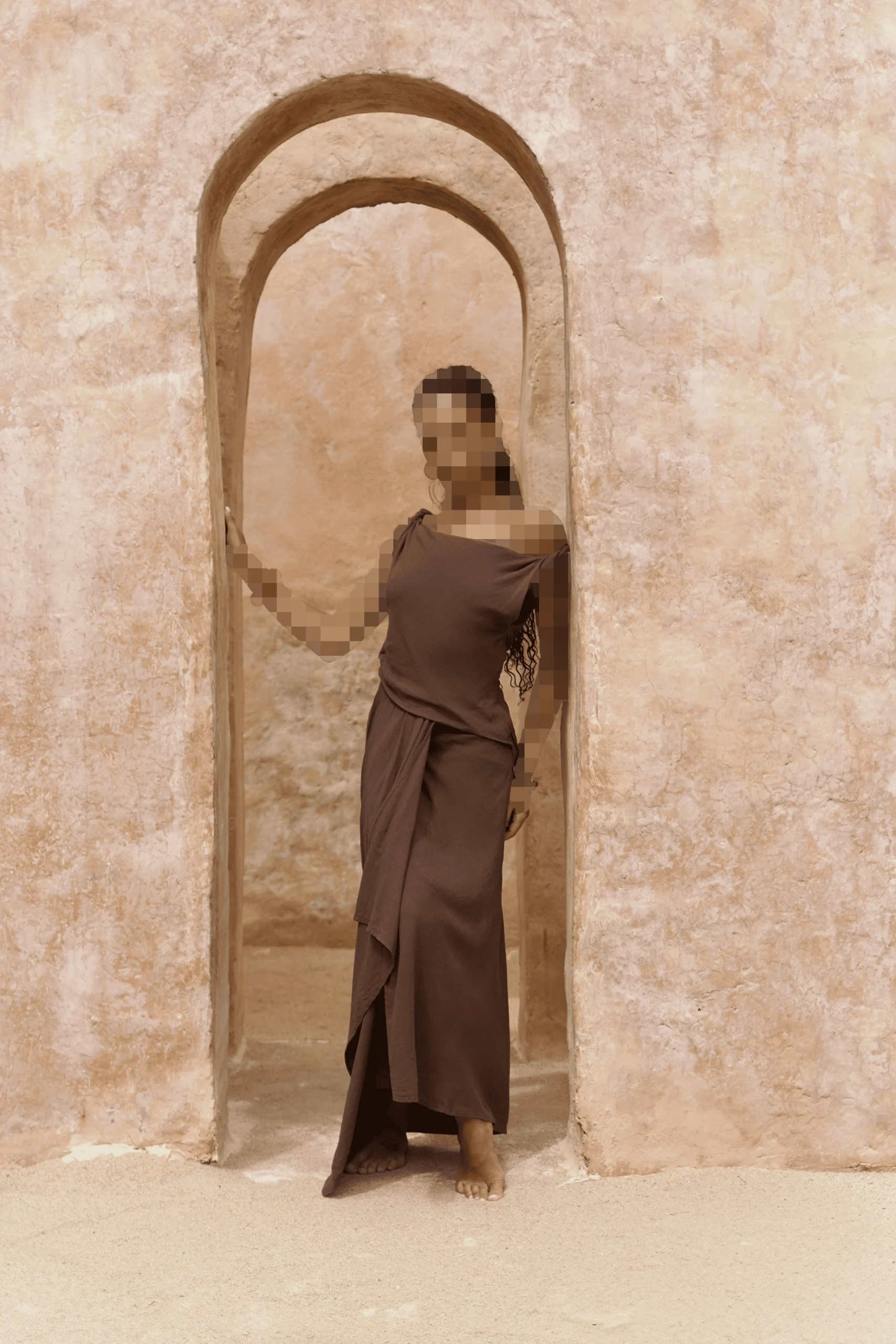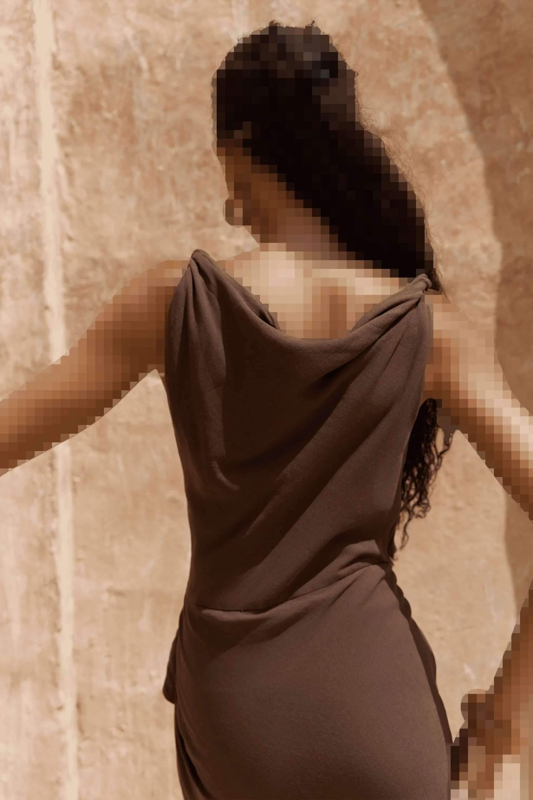لباس بدون آستین، بنددار ضخیم، آویخته، برش نامتقارن با جزئیات گره. برش لایه لایه در کمر، طرح روان با لبه پهن. قسمت پشت باید با زیپ بسته شود. بدون آستر.